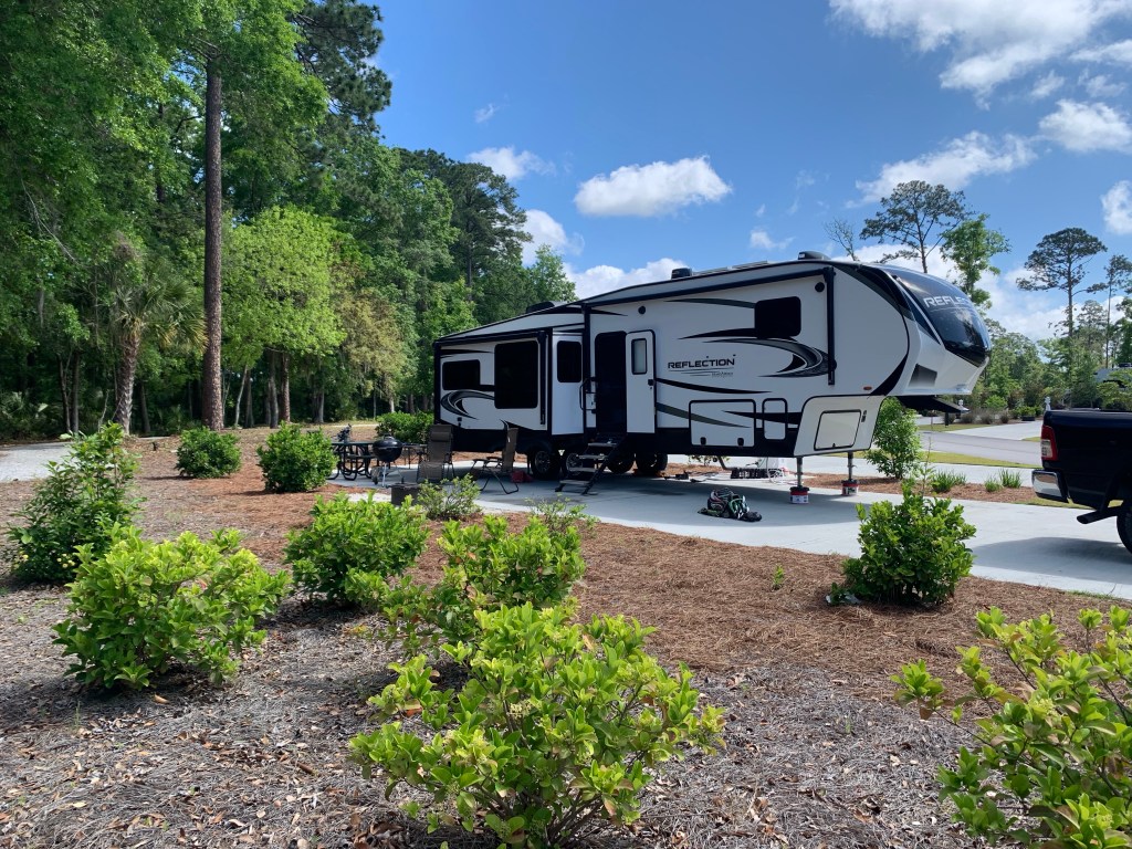 Seriously, Hilton Head National RV Resort and Cottages is treating us well. Our first clue was the escort to our site and guidance backing in (thankfully, relieving me of my usual duties). It’s a gated community, with impeccable grounds. The site has a concrete pad with a nice wooded area behind us. The resort clubhouse offers pickleball, a heated swimming pool, a lazy river, a hot tub, a Tiki bar, and a restaurant. If we had a dog, we could let it play in the gated dog park, and follow it up with a visit to the polished-granite, dog-washing house. π