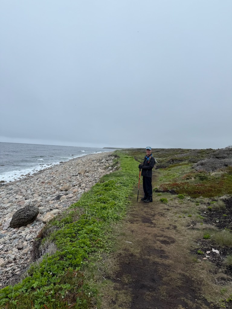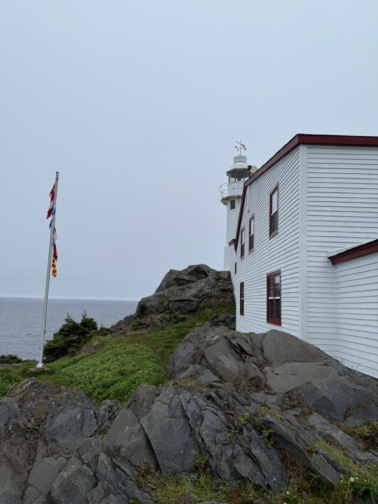 Now I have a bit of experience with bears from my almost 25 years of back country camping in Algonquin with Cody and a number of times Gary and Jordan. We have come across bears crossing our path in creeks and coming into camp at night. Nothing has ever happened but it’s always a little unnerving. Given it was just us, visibility was next to nothing and you don’t want to startle a bear – how could you not when you can barely see in front of you – we decided to head into Trout River, look around and come back if it cleared. When we got back there were a couple of cars that pulled in and Di got out to talk with others that were considering the hike. One couple immediately said nope. Another mother and daughter were contemplating. There was a woman who was a guide and was there on her off day and she said the problem really wasn’t the bears it was the conditions. The hike was 9km there and back – it isn’t considered an easy hike – and she said with the rain and given the slope it would be tricky. She figured 2 hours in – mostly down grade – and 4 hours back….and it was cold and windy. We decided we would look for another trail. Funny how one lost opportunity creates another that may not have happened. We decided to head to Green Point for a 6km hike along the coast. On our way there we went by Lobster Cove Head Lighthouse….very cool.
